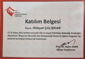 Eğitim ve tecrübelerimi, Milli Eğitim Bakanlığı, Adalet Bakanlığı ve Aile ve Sosyal Politikalar Bakanlığı’na bağlı olarak gerçekleştirdiğim çalışmalarda pekiştirdim. 2012’de Aile Eğitimi Programı Formatörü oldum ve bölge koordinatörlüğü görevlerini başarıyla tamamladım. 2015’ten bu yana, online terapi ve psikolojik danışmanlık hizmetlerine ağırlık veriyorum.